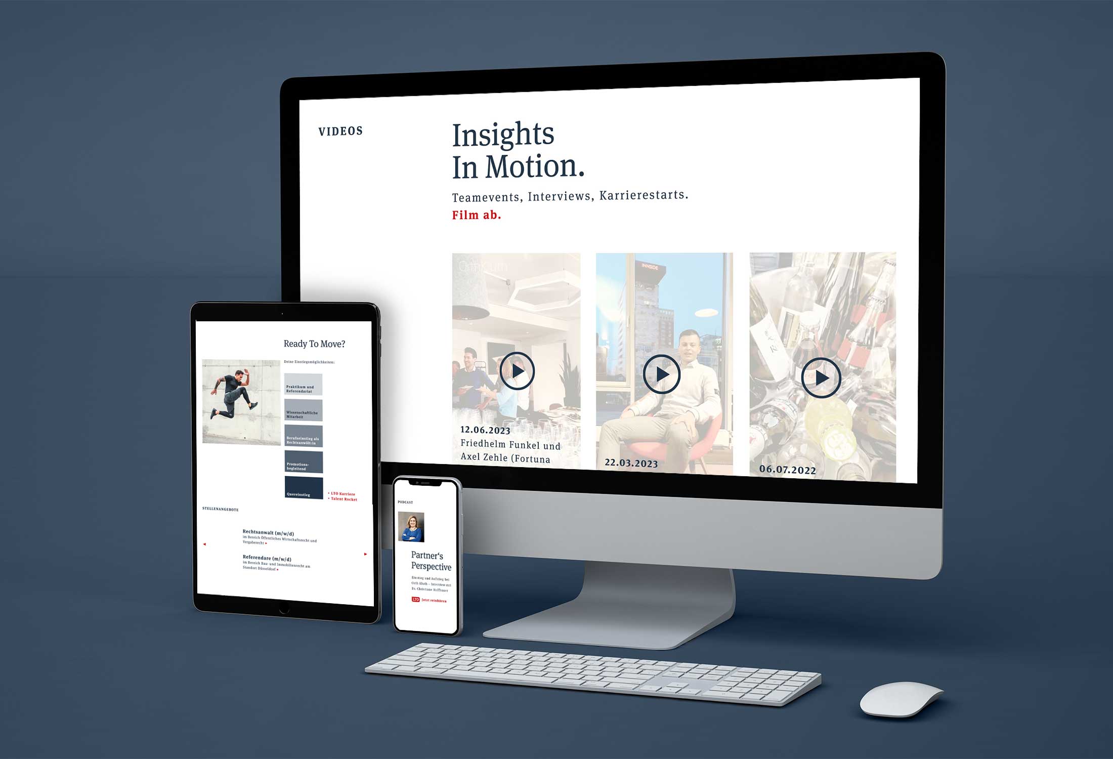 Nach einem Kreativpitch mit drei Agenturen haben wir uns mit einem Kreativ- und Designkonzept für die neue Website durchgesetzt. Neben dem puristischen Design sorgen auch Split-Screen-Imagevideos für einen ungewöhnlichen Kanzleiauftritt. Die parallel laufenden Filmszenen verbinden die Kanzlei- und Mandantenwelten zu kompakten, dynamischen Visuals. Analog zum beibehaltenen zweiteiligen Slogan arbeiten auch alle Themenheadlines mit geschmeidigen Alliterationen.