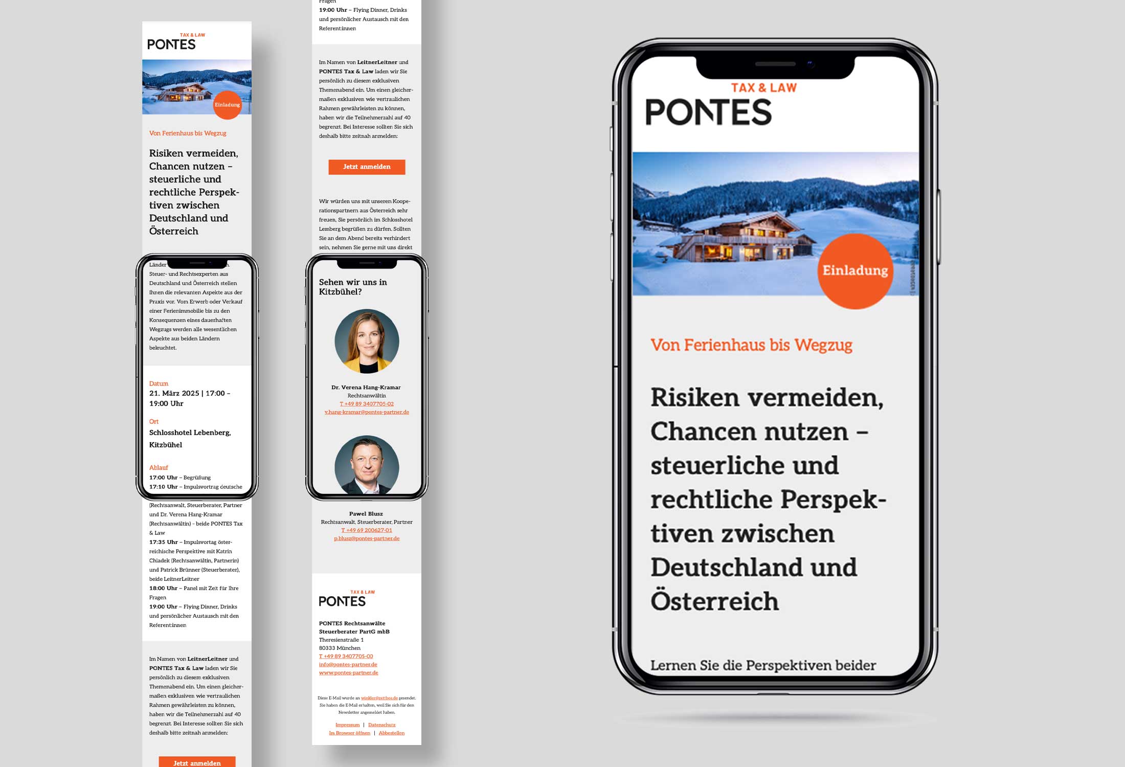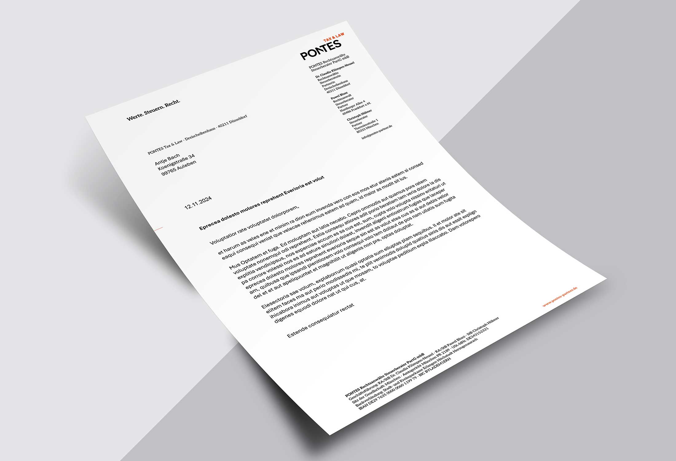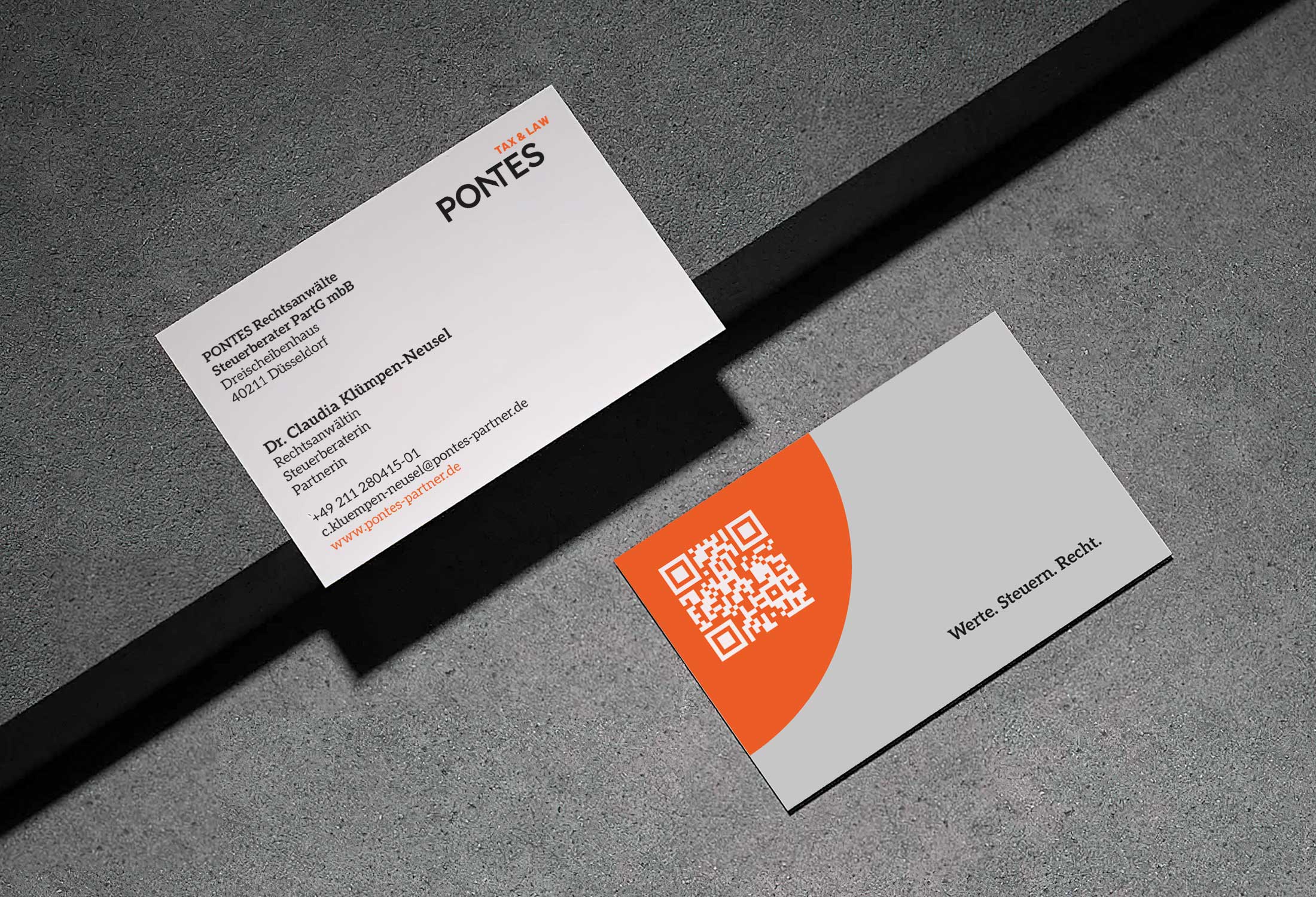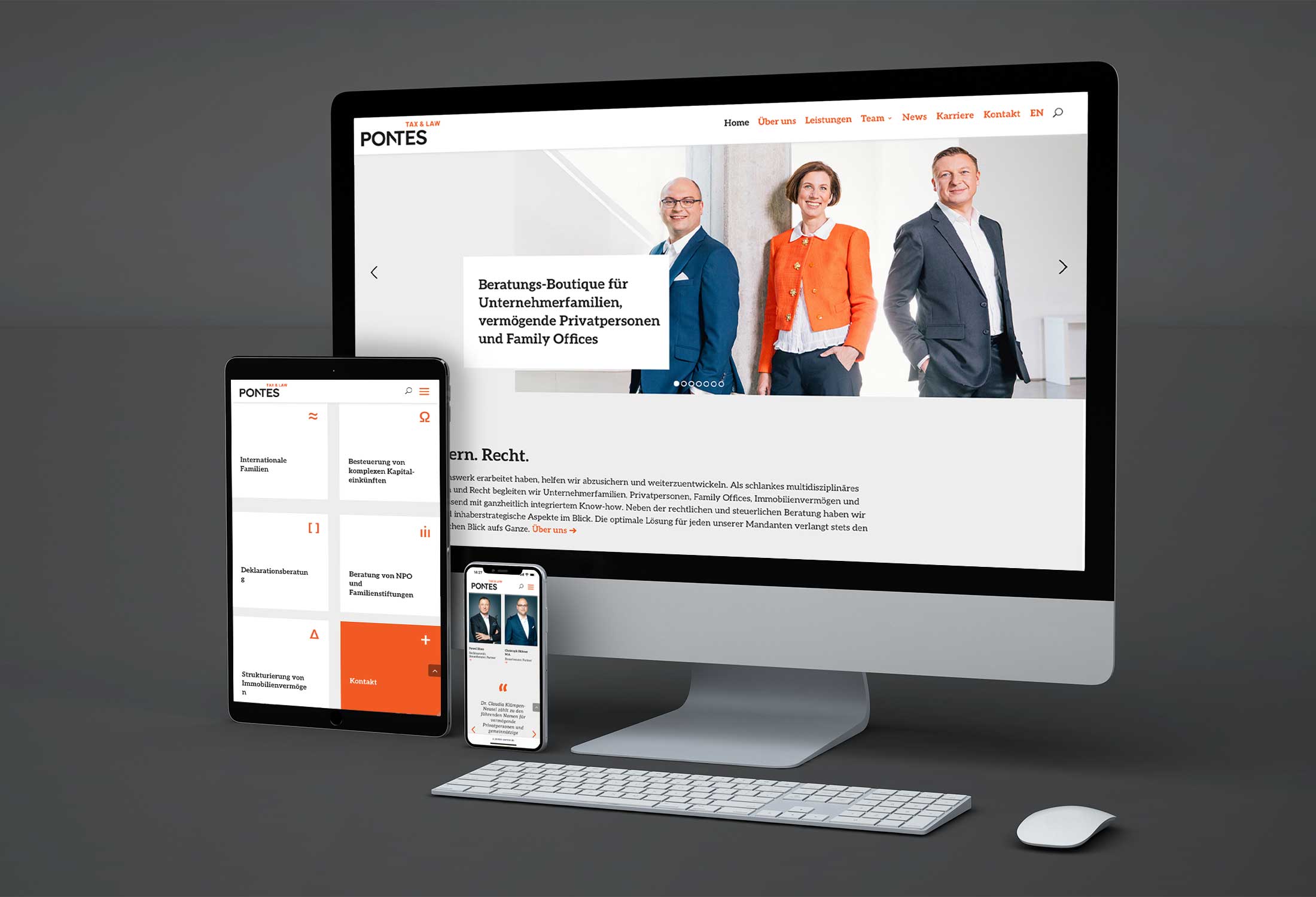 PONTES Tax & Law – Werte. Steuern. Recht. Namen und Slogan bringen das komplexe Dienstleistungs- und Beratungsangebot der spezialisierten Boutique mit einem zeitgemäßen Dreisprung auf den Punkt. Kanzleiausstattung und Website verbinden die vielfältigen Lösungsangebote und Kompetenzen mit den aktiven Köpfen der Kanzlei – die Persönlichkeiten werden als die treibende Kräfte des Unternehmens sichtbar. Das schlichte, klare Design mit frischen Farbakzenten lässt bei allen Instrumenten Agilität und Vertrauen mitschwingen.