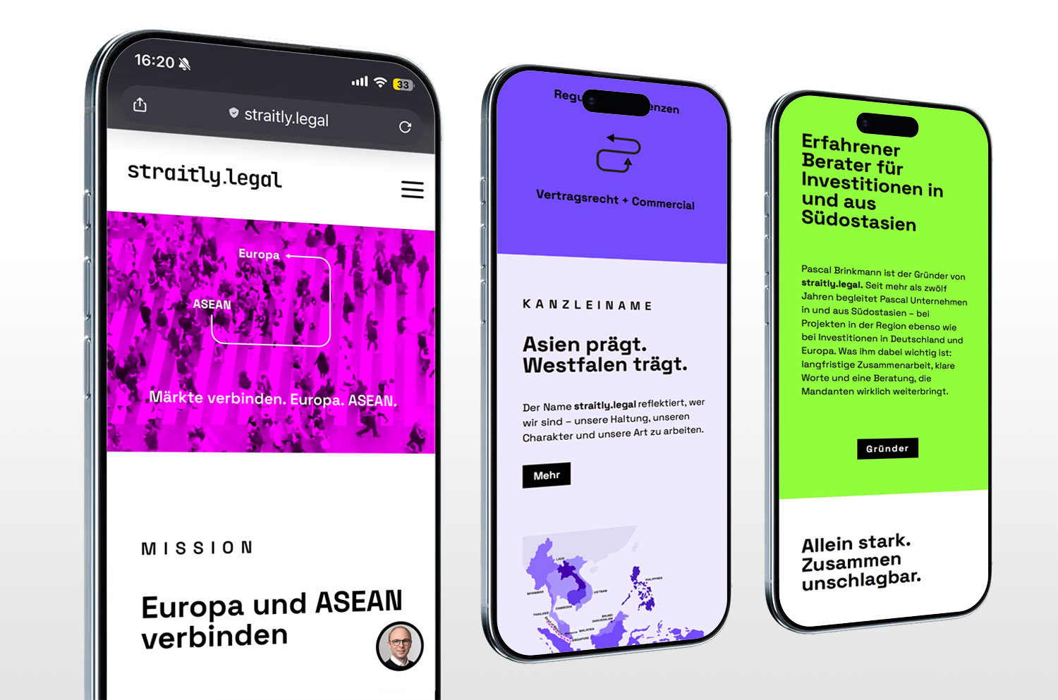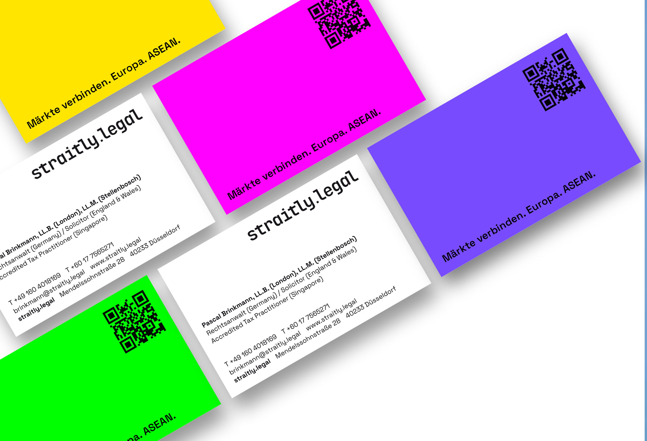 Das Kanzleikonzept von straitly.legal ist gleich mehrfach innovativ. Mit Legal Tech Tools wird der Service beschleunigt und perfektioniert. Und für den fachlichen Focus auf den Transfer von Geschäftsaktivitäten zwischen Europa und dem ASEAN-Raum ist auch inhaltlich eine Alleinstellung garantiert. Da sollten dann auch das Design- und Kreativkonzept mithalten können.